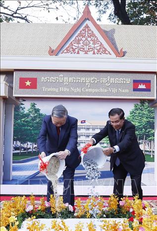 Tổng Bí thư Tô Lâm và Chủ tịch Đảng Nhân dân Campuchia, Chủ tịch Thượng viện Campuchia Samdech Techo Hun Sen thực hiện nghi thức động thổ Trường Hữu nghị Campuchia - Việt Nam. Ảnh: Thống Nhất – TTXVN