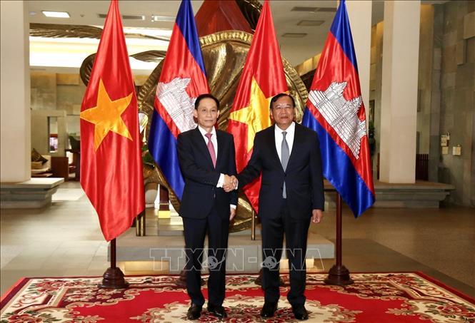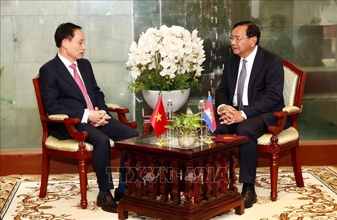 Bộ trưởng Bộ Ngoại giao Việt Nam Lê Hoài Trung (trái) và Phó Thủ tướng, Bộ trưởng Ngoại giao và Hợp tác quốc tế Campuchia Prak Sokhonn tại cuộc gặp riêng. Ảnh: Quang Anh – PV TTXVN tại Campuchia.