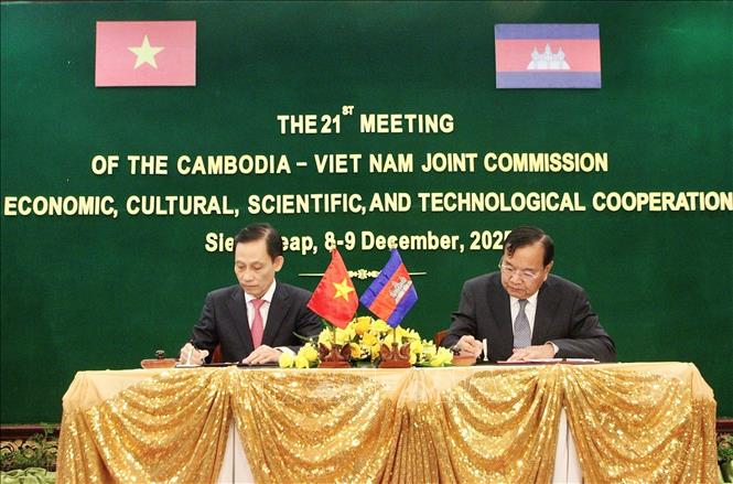 Kỳ họp lần thứ 21 Ủy ban Hỗn hợp Việt Nam-Campuchia về hợp tác kinh tế, văn hoá, khoa học và kỹ thuật, diễn ra tại tỉnh Siem Reap, Vương quốc Campuchia. Ảnh: Quang Anh - PV TTXVN tại Campuchia