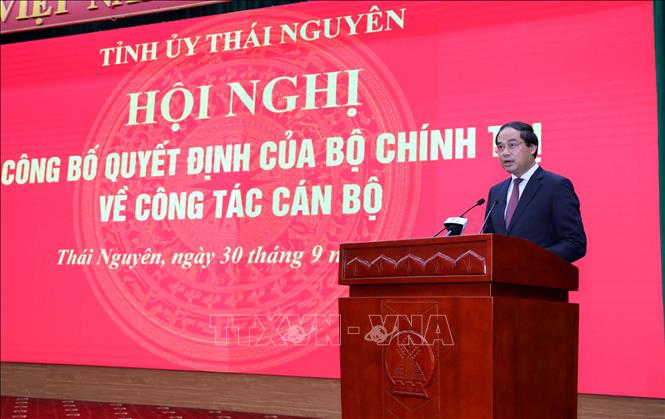 [30/09/2025 17:30:29] Chiều 30/9/2025, tại tỉnh Thái Nguyên, Ban Thường vụ Tỉnh ủy Thái Nguyên tổ chức Hội nghị công bố quyết định của Bộ Chính trị về công tác cán bộ. Dự hội nghị có đồng chí Lê Minh Hưng, Ủy viên Bộ Chính trị, Bí thư Trung ương Đảng, Trưởng ban Tổ chức Trung ương; đại diện một số bộ, ngành Trung ương; lãnh đạo tỉnh Thái Nguyên và các sở, ngành, địa phương trong tỉnh. Tại hội nghị, lãnh đạo Ban Tổ chức Trung ương đã công bố Quyết định của Bộ Chính trị về việc điều động, phân công, chỉ định đồng chí Trịnh Xuân Trường, Bí thư Tỉnh ủy Lào Cai, tham gia Ban Chấp hành, Ban Thường vụ, giữ chức Bí thư Tỉnh ủy Thái Nguyên nhiệm kỳ 2025 – 2030. Ảnh: Thu Hằng-TTXVN