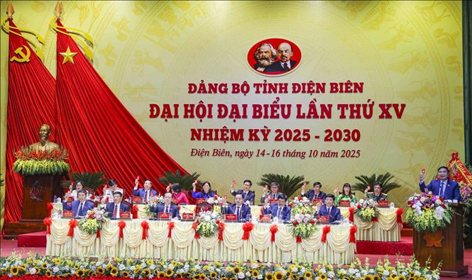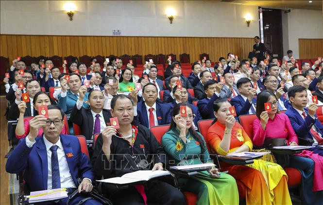 Đại biểu biểu quyết thông qua danh sách nhân sự Ban Chấp hành Đảng bộ tỉnh Điện Biên khóa XV, nhiệm kỳ 2025 - 2030. Ảnh: Xuân Tư - TTXVN