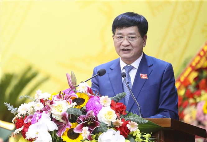 Tân Bí thư Tỉnh ủy Điện Biên Trần Tiến Dũng phát biểu nhận nhiệm vụ. Ảnh: Xuân Tư - TTXVN
