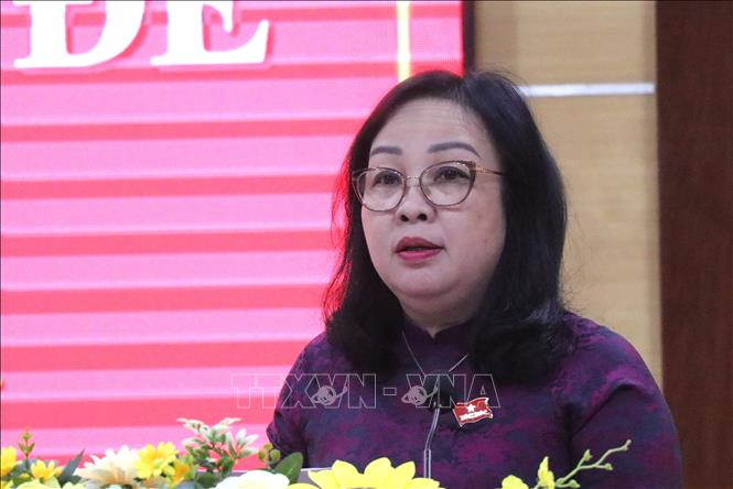 Bà Cao Thị Hòa An, Ủy viên TƯ Đảng, Phó Bí thư thường trực Tỉnh ủy Đắk Lắk đánh giá Đại hội XIV của Đảng vừa mang ý nghĩa định hướng chiến lược lâu dài, vừa cụ thể hóa bằng những mục tiêu, giải pháp có tính hành động cao. Ảnh: Ngọc Minh - TTXVN