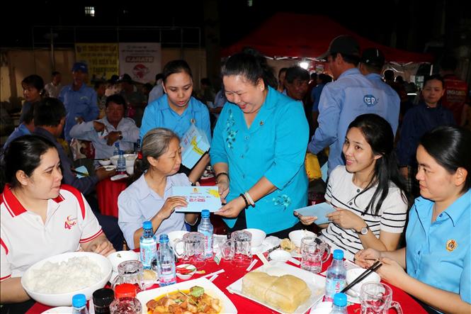 Lãnh đạo Liên đoàn Lao động Thành phố Hồ Chí Minh tặng quà cho đoàn viên, người lao động có hoàn cảnh khó khăn. Ảnh: Thanh Vũ-TTXVN
