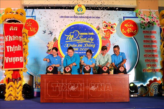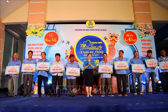 Lãnh đạo Liên đoàn Lao động Thành phố Hồ Chí Minh tặng quà Tết cho đoàn viên, người lao động có hoàn cảnh khó khăn. Ảnh: Thanh Vũ-TTXVN