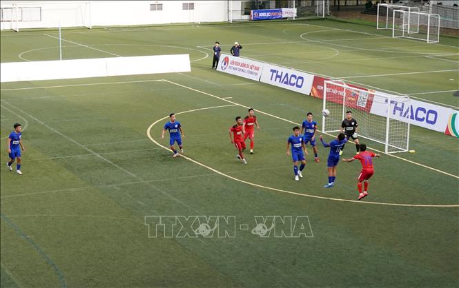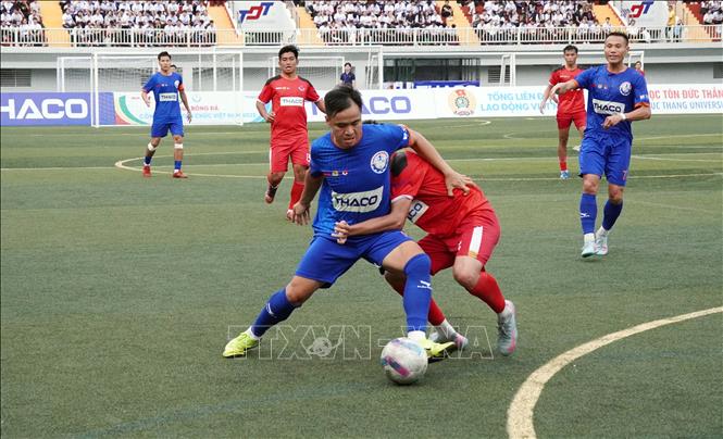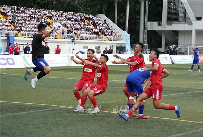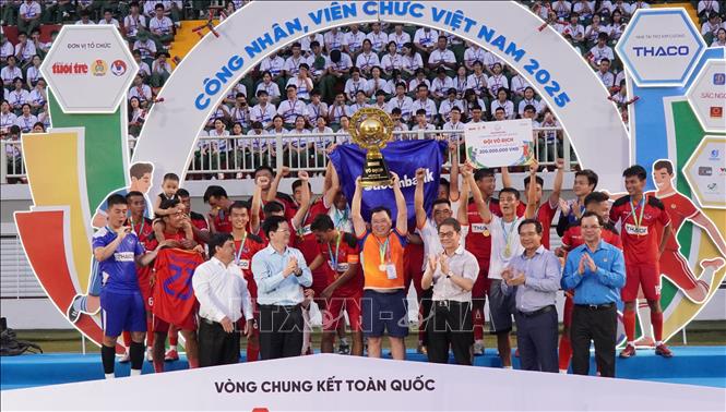 Chiều 2/11/2025, tại SVĐ trường Đại học Tôn Đức Thắng (TP Hồ Chí Minh) diễn ra trận chung kết giữa đội bóng Công đoàn Ngân hàng Việt Nam gặp Sacombank trong khuôn khổ VCK Giải bóng đá công nhân, viên chức Việt Nam năm 2025. Kết thúc trận đấu, đội bóng Sacombank giành Cúp vô địch sau khi giành chiến thắng ở những loạt sút luân lưu. Ảnh: Trung Tuyến - TTXVN