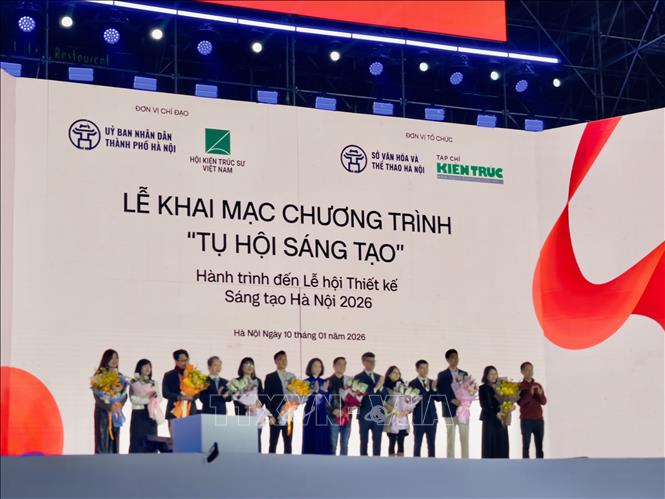 Các đại biểu thực hiện nghi lễ khai mạc Chương trình “Tụ hội sáng tạo”. Ảnh: Hoàng Hiếu - TTXVN