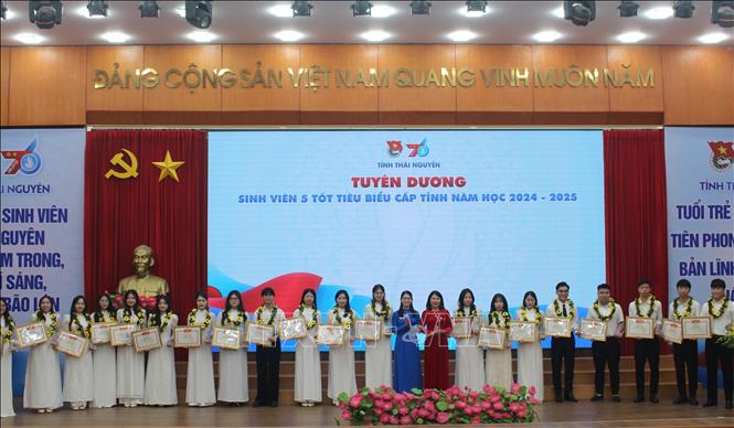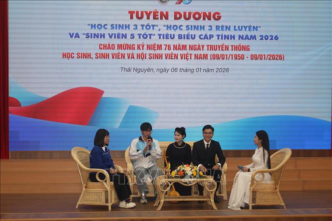 [06/01/2026 19:06:05] Ngày 6/1/2026, tại Trường Đại học Sư phạm – Đại học Thái Nguyên, Ban Thường vụ Tỉnh đoàn, Ban Thư ký Hội Sinh viên Việt Nam tỉnh Thái Nguyên tổ chức Chương trình tuyên dương “Học sinh 3 tốt”, “Học sinh 3 rèn luyện”, “Sinh viên 5 tốt” và “Tập thể Sinh viên 5 tốt” tiêu biểu cấp tỉnh năm học 2024-2025. Ảnh: Thu Hằng-TTXVN