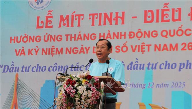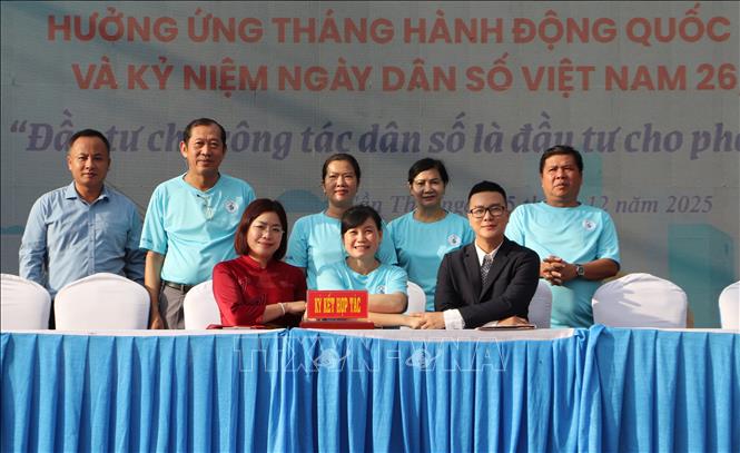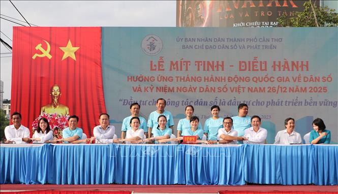 Sáng 25/12/2025, Ban Chỉ đạo Dân số và Phát triển thành phố Cần Thơ tổ chức Lễ mít tinh, diễu hành hưởng ứng Tháng hành động quốc gia về dân số và kỷ niệm Ngày Dân số Việt Nam (26/12). Dịp này, Chi cục Dân số - Xã hội thành phố Cần Thơ, các đơn vị y tế trên địa bàn thành phố và các đơn vị đồng hành ký cam kết phối hợp tổ chức các hoạt động hỗ trợ cho địa phương về khám sức khỏe người cao tuổi, chăm sóc sức khỏe sinh sản, sàng lọc vô sinh hiếm muộn, tầm soát các bệnh lý về máu, sàng lọc ung thư, lao tại cộng đồng. Ảnh: Hồng Thái - TTXVN