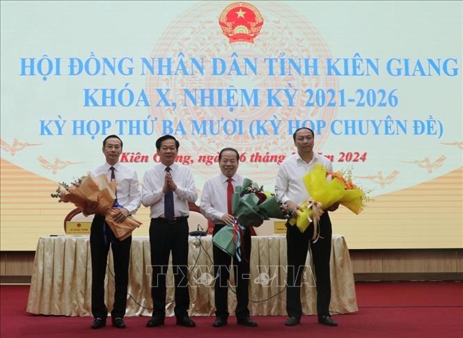 [26/12/2024 12:25:59] Ngày 26/12/2024, Ban Thường vụ Tỉnh ủy Kiên Giang tổ chức Hội nghị Ban Chấp hành Đảng bộ tỉnh (đột xuất) công bố Quyết định của Ban Bí thư Trung ương Đảng chuẩn y đồng chí Nguyễn Thanh Nhàn, Uỷ viên Ban Thường vụ Tỉnh ủy, Phó Chủ tịch UBND tỉnh Kiên Giang giữ chức Phó Bí thư Tỉnh uỷ Kiên Giang nhiệm kỳ 2020 - 2025. Tiếp đến, HĐND dân tỉnh tổ chức Kỳ họp thứ 30 (kỳ họp chuyên đề) để miễn nhiệm chức Chủ tịch UBND tỉnh đối với ông Lâm Minh Thành; đồng thời, bầu ông Lâm Minh Thành giữ chức Chủ tịch HĐND tỉnh nhiệm kỳ 2021 - 2026; bầu ông Nguyễn Thanh Nhàn, Phó Bí thư Tỉnh uỷ, Phó Chủ tịch UBND tỉnh giữ chức Chủ tịch UBND tỉnh Kiên Giang nhiệm kỳ 2021 - 2026. Ảnh: Lê Huy Hải - TTXVN