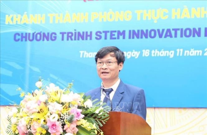 Hiệu trưởng Trường THPT Chuyên Lam Sơn Nguyễn Thanh Sơn báo cáo kết quả xây dựng phòng học STEM. Ảnh: TTXVN phát