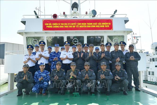 [09/01/2026 17:20:28] Ngày 9/1/2026, tại cảng Hải đội 401, Bộ Tư lệnh Vùng Cảnh sát biển 4 (đặc khu Phú Quốc, tỉnh An Giang), Thiếu tướng Nguyễn Văn Dũng, Bí thư Đảng ủy, Chính ủy Bộ Tư lệnh Vùng Cảnh sát biển 4 đến thăm, động viên và giao nhiệm vụ cho cán bộ, chiến sĩ Tàu KN-373, Chi đội Kiểm ngư số 3, Bộ Tư lệnh Vùng Cảnh sát biển 2, phối hợp với đơn vị chức năng thuộc Bộ Tư lệnh Vùng Cảnh sát biển 4 thực hiện nhiệm vụ phòng, chống khai thác hải sản bất hợp pháp, không báo cáo và không theo quy định (IUU), trước giờ lên đường thực hiện nhiệm vụ này trong dịp Tết Nguyên đán Bính Ngọ 2026. Ảnh: TTXVN phát