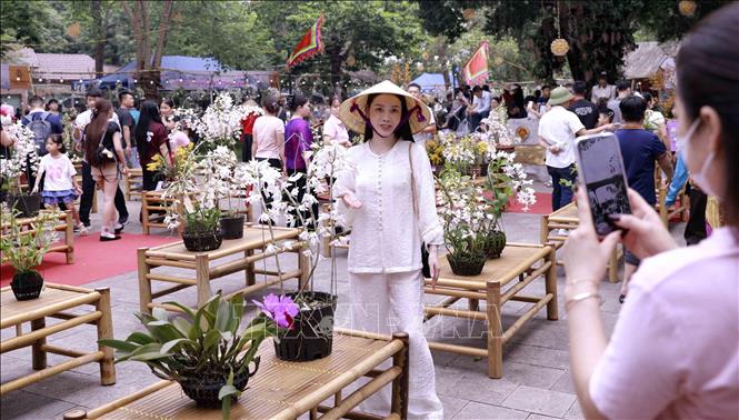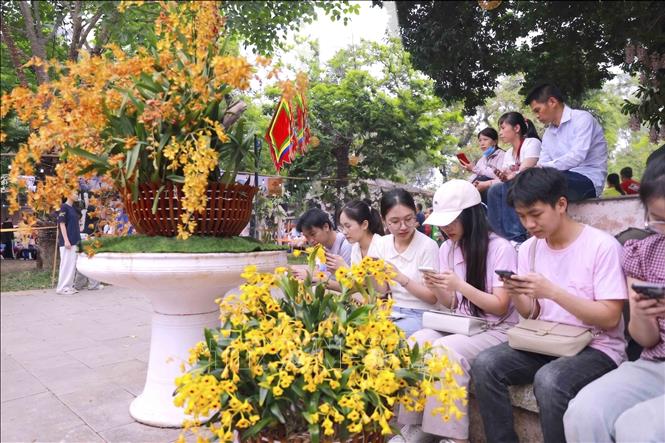 Du khách thích thú ghi lại khoảnh khắc bên những giò lan rực rỡ tại Đền Hùng. Ảnh: Hoàng Hùng – TTXVN