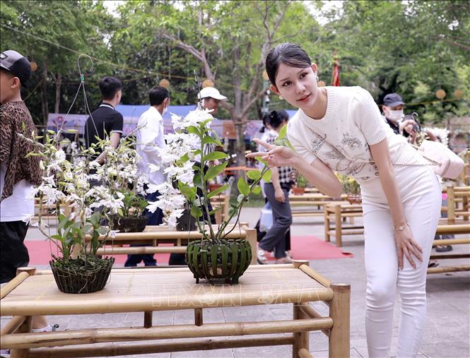 Phái đẹp tạo dáng chụp ảnh giữa không gian ngập tràn sắc hoa phong lan, nổi bật giữa những gam màu tươi tắn. Ảnh: Hoàng Hùng – TTXVN