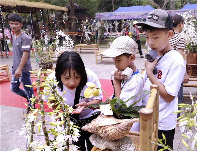 Trẻ em thích thú ngắm nhìn và khám phá những chậu phong lan rực rỡ tại khu trưng bày. Ảnh: Hoàng Hùng – TTXVN