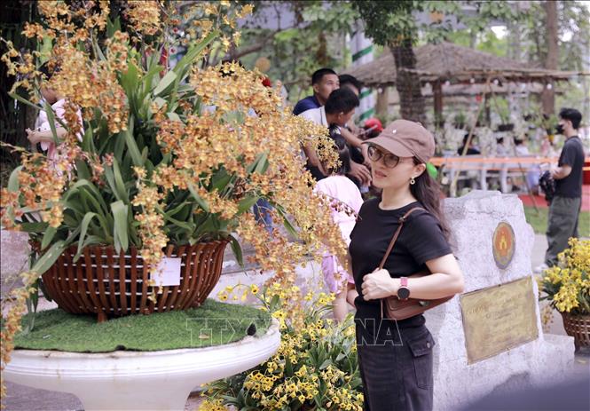 Phái đẹp lưu lại khoảnh khắc bên những giò phong lan rực rỡ, tạo điểm nhấn giữa không gian trưng bày. Ảnh: Hoàng Hùng – TTXVN