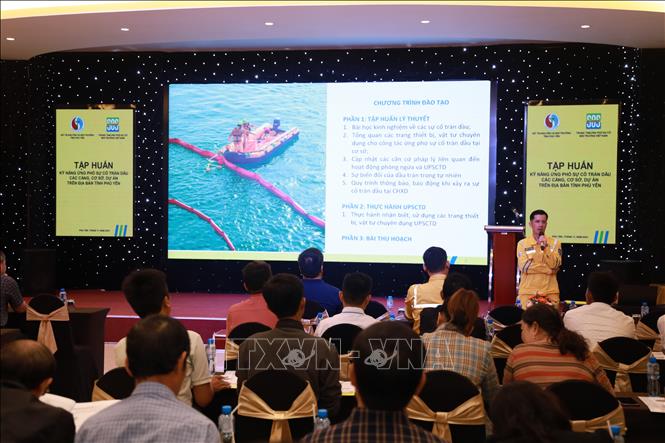 [27/11/2024 17:05:34] Ngày 27/11/2024, tại thành phố Tuy Hòa (tỉnh Phú Yên), Trung tâm Ứng phó sự cố môi trường Việt Nam (Trung tâm SOS môi trường) phối hợp với Sở Tài nguyên và Môi trường tỉnh Phú Yên tổ chức Khóa tập huấn kỹ năng ứng phó sự cố tràn dầu tại các cảng, cơ sở, dự án trên địa bàn tỉnh. Ảnh: Xuân Triệu - TTXVN