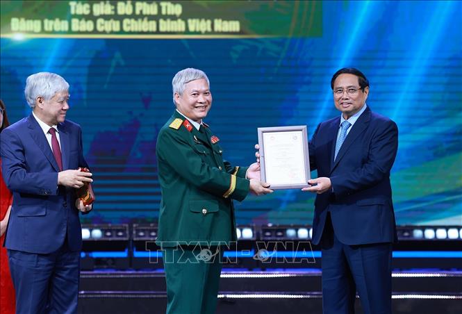 Thủ tướng Phạm Minh Chính và Chủ tịch UBTW MTTQ Việt Nam Đỗ Văn Chiến trao Giải A cho tác giả Đỗ Phú Thọ với loạt 3 bài "Cựu chiến binh bền bỉ chống "Giặc nội xâm'" đăng trên Báo Cựu chiến binh Việt Nam. Ảnh: Dương Giang-TTXVN