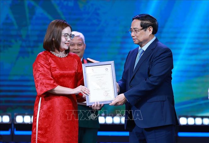 Thủ tướng Phạm Minh Chính trao Giải A cho đại diện nhóm tác giả với tác phẩm "Nghịch lý đầu tư xử lý rác thải bằng công nghệ" phát sóng trên VTV1, Đài Truyền hình Việt Nam. Ảnh: Dương Giang-TTXVN