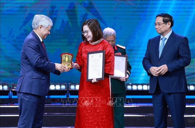 Thủ tướng Phạm Minh Chính và Chủ tịch UBTƯ MTTQ Việt Nam Đỗ Văn Chiến trao Giải A cho đại diện nhóm tác giả của Báo điện tử Kiểm toán với loạt 5 bài "Chống lãng phí trong lĩnh vực khoa học, công nghệ". Ảnh: Dương Giang-TTXVN