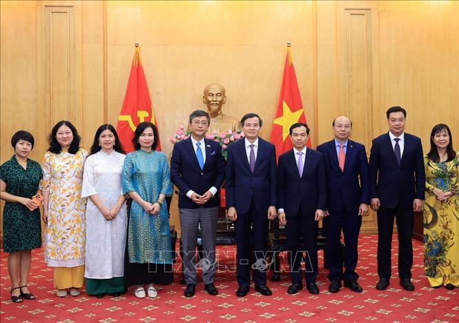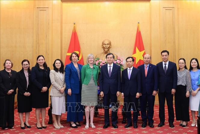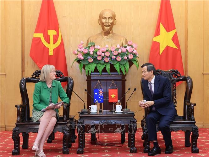 Đồng chí Đoàn Minh Huấn, Uỷ viên Bộ Chính trị, Giám đốc Học viện Chính trị Quốc gia Hồ Chí Minh tiếp bà Gillian Bird, Đại sứ Australia tại Việt Nam. Ảnh: Tuấn Anh - TTXVN