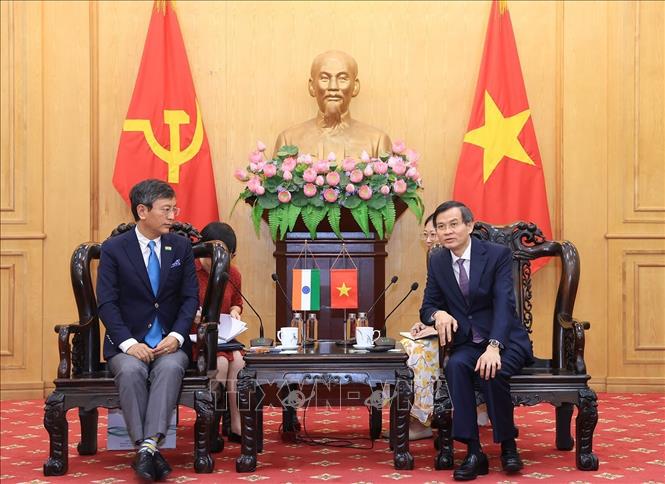 Đồng chí Đoàn Minh Huấn, Uỷ viên Bộ Chính trị, Giám đốc Học viện Chính trị Quốc gia Hồ Chí Minh tiếp Ngài Tshering W. Sherpa, Đại sứ Cộng hoà Ấn Độ tại Việt Nam. Ảnh: Tuấn Anh - TTXVN