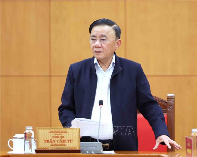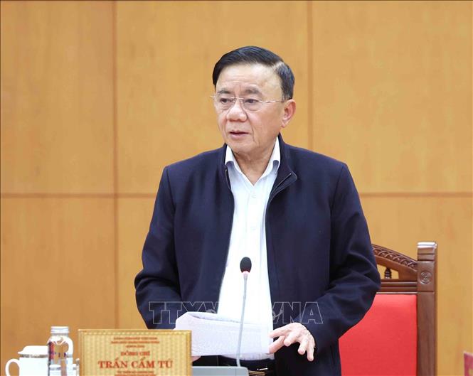 Đồng chí Trần Cẩm Tú, Uỷ viên Bộ Chính trị, Thường trực Ban Bí thư, Trưởng Tiểu ban Tổ chức phục vụ Đại hội XIV phát biểu chỉ đạo buổi làm việc. Ảnh: Phương Hoa – TTXVN