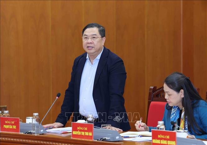 Đồng chí Phạm Gia Túc, Uỷ viên Trung ương Đảng, Chánh Văn phòng Trung ương Đảng phát biểu tại buổi làm việc. Ảnh: Phương Hoa – TTXVN
