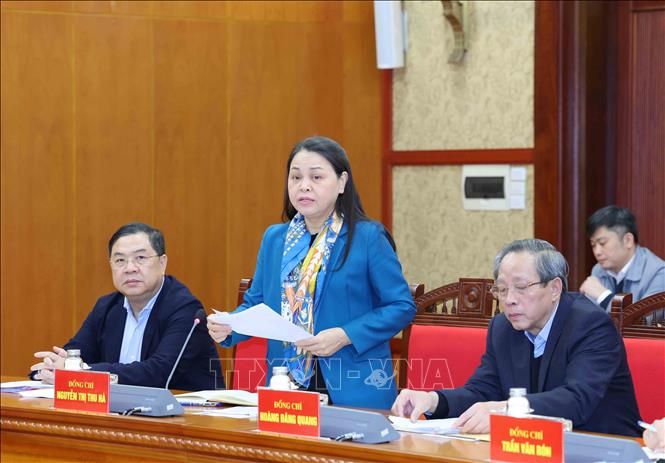Đồng chí Nguyễn Thị Thu Hà, Uỷ viên Trung ương Đảng, Phó Chánh Văn phòng Thường trực Văn phòng Trung ương Đảng trình bày báo cáo tại buổi làm việc. Ảnh: Phương Hoa – TTXVN