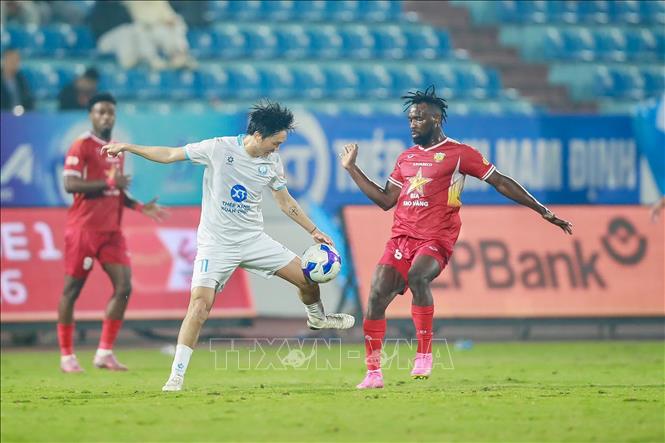 [09/02/2026 20:17:04] Tối 9/2/2026, trên sân vận động Thiên Trường, tỉnh Ninh Bình diễn ra trận thi đấu giữa Câu lạc bộ Thép Xanh Nam Định (áo trắng) gặp Câu lạc bộ Hồng Lĩnh Hà Tĩnh (áo đỏ), trong khuôn khổ vòng thi đấu thứ 13, Giải bóng đá vô địch quốc gia LPBank V.League 2025/2026. Kết thúc trận đấu, hai đội hòa với tỷ số 1-1. Ảnh: Công Luật - TTXVN