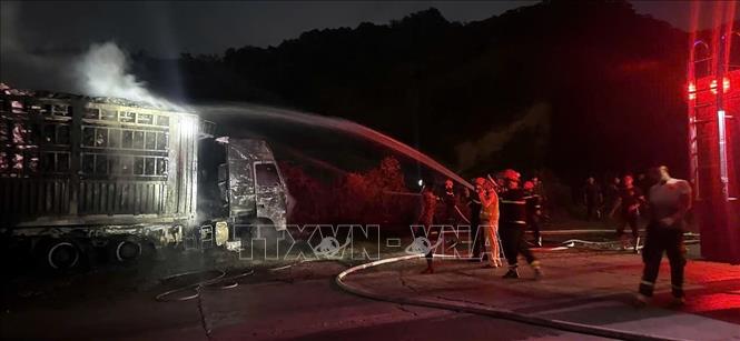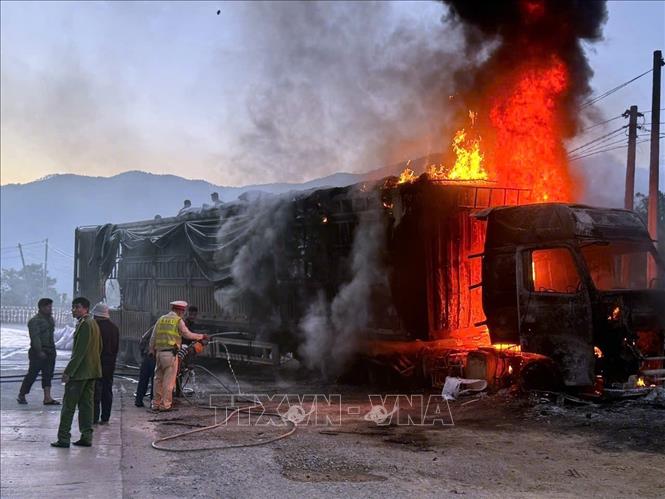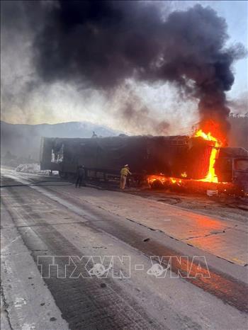 [09/02/2026 19:28:16] Vào khoảng 16 giờ ngày 9/2/2026, tại Km 1425+800 trên đường Hồ Chí Minh, đoạn qua đèo Lò Xo, thuộc xã Đăk Plô (Quảng Ngãi), ô tô đầu kéo kéo biểm kiểm soát 82H 002.48 kéo theo sơmi rơ-moóc lưu thông theo hướng Quảng Ngãi đi Đà Nẵng, trên xe chở bột mì, đến khu vực này bất ngờ bốc cháy, tài xế nhanh chóng cho xe tấp vào lề đường. Vụ việc không gây thiệt hại về người. Phần đầu xe đầu kéo bị cháy hoàn toàn, 1/3 số bột mì trên xe bị cháy. Đến khoảng 18 giờ 30 phút, vụ cháy cơ bản đã được khống chế. Ảnh: TTXVN phát