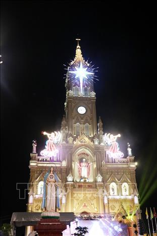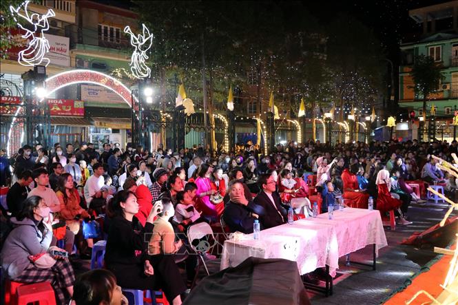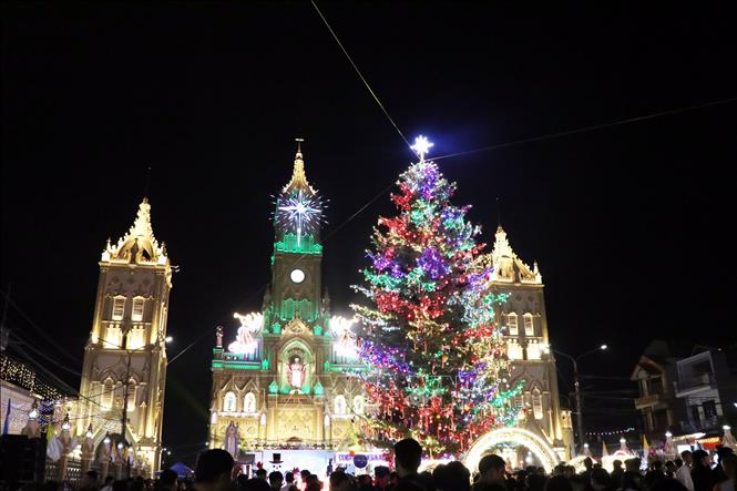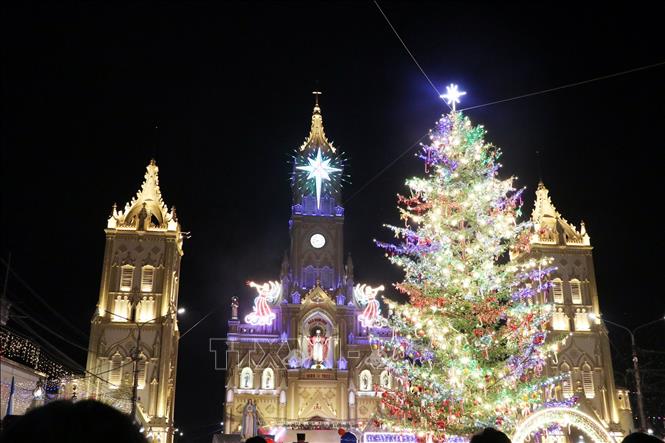 Đêm Giáng sinh, khắp mọi nẻo đường ở xã Kẻ Sặt, thành phố Hải Phòng rực rỡ đèn hoa, rộn ràng tiếng nhạc mừng Giáng sinh. Nhà thờ Kẻ Sặt bừng sáng lung linh nhờ được trang hoàng rực rỡ với các tiểu cảnh hang đá, cây thông, ông già Noel, tuần lộc… Du khách nườm nượp đổ về nhà thờ Kẻ Sặt, hân hoan hòa cùng bầu không khí lễ hội nơi đây. Xã Kẻ Sặt có 1.850 hộ dân là đồng bào công giáo với 7.750 nhân khẩu. Trên địa bàn có 3 giáo xứ gồm: Giáo xứ Kẻ Sặt, Giáo xứ Thánh An Tôn và Giáo xứ Thánh Phê rô. Ảnh: Mạnh Tú - TTXVN