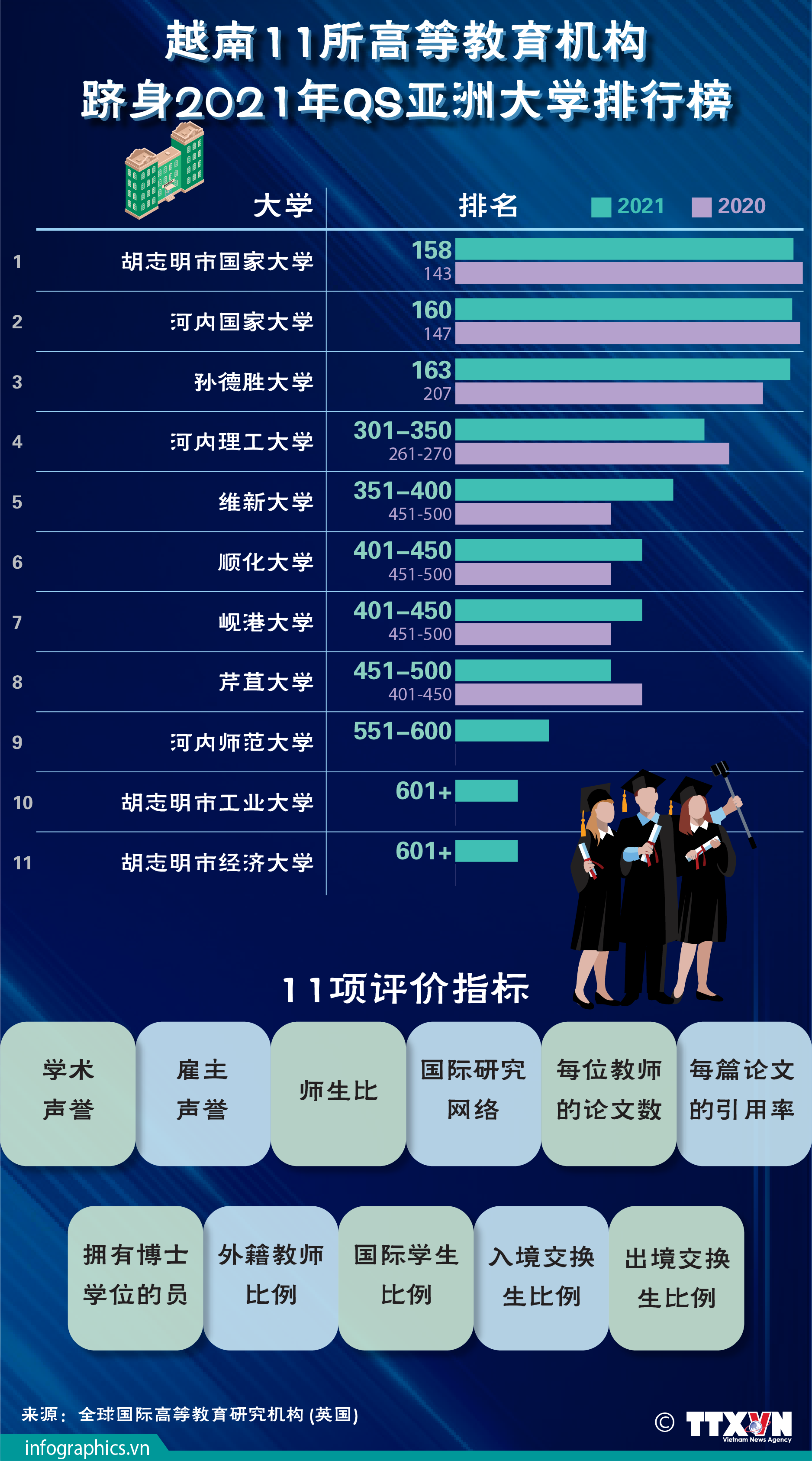 图表新闻 越南11所高等教育机构跻身2021年QS亚洲大学排行榜 越南11所高等教育机构刚跻身由全球国际高等教育研究机构(Quacquarelli Symonds)发布的2021年QS亚洲大学排行榜,与2020年相比增加了3所。 日期:11/29/2020 22:17 格式:.png 类别:教育 下载: 标签:全球国际高等教育研究机构, Quacquarelli Symonds, 亚洲大学排行榜 分享:Plugin Social